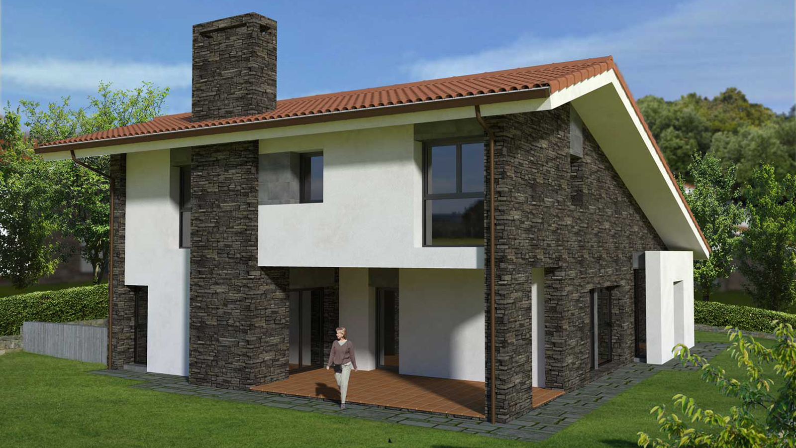 Infografías exteriores para promoción inmobiliaria de un conjunto residencial en el concejo de Llanes; compuesto por varias viviendas unifamiliares aisladas con parcela.